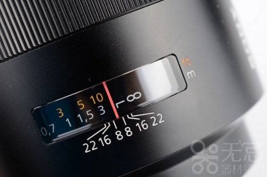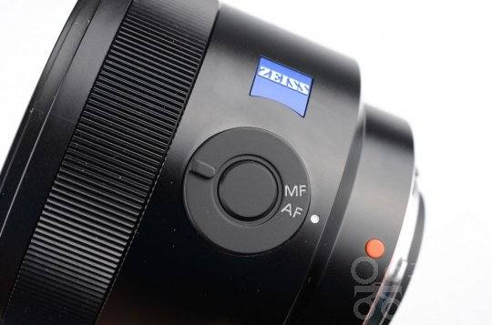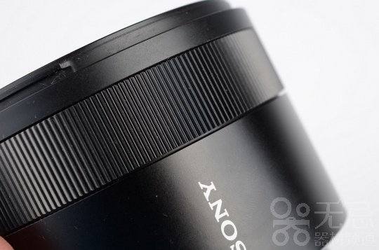 镜头靠近前端为对焦环,阻尼适中。镜头两侧分别有ZEISS和SONY的LOGO,在ZEISS小蓝标下面是对焦模式选择环(MF/AF),对焦选择环的中央则是对焦保持按钮。该设计我们索尼(美能达)镜头上常常可以看到。