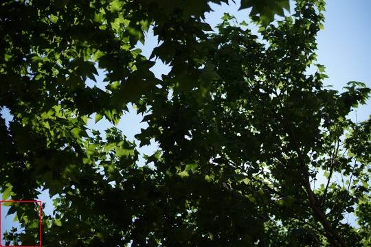 大光比逆光下,我们观察一下树叶与天空明暗交接部分。从图中可以看到这款镜头F1.4全开光圈存在明显紫边,随着光圈收缩,虽然紫边有所减轻,但依然明显。
