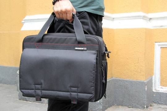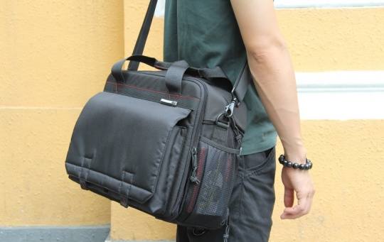 产品外观以全黑为主,辅以红线作点缀。整体感觉偏简洁实用,没有太多花哨的外观装饰。摄影包背部还加入了独特的后舱取镜设计,方便实用。