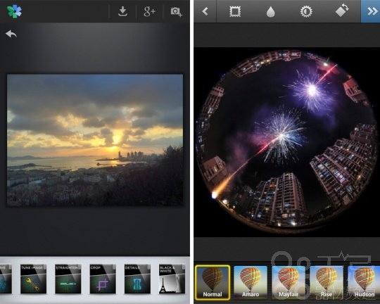 一个是instagram,这个软件大名鼎鼎,拍摄的照片上了时代杂志封面!特点是只有方图可以选择,有多种滤镜,必有一款适合你!其他的微缩景观效果等和上面的类似。但是缺点是滤镜浓度、边框均固定不可调。下图左侧是snapseed,右侧是instagram