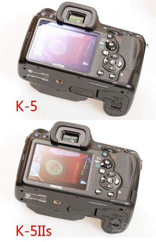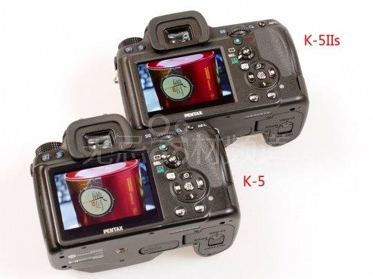 K-5 II/K-5 IIs相比K-5,最大的升级在于采用全新的SAFOX X自动对焦模块和92万像素的3.0英寸广视角LCD显示屏。该对焦模块支持最低-3EV的昏暗环境下自动对焦,目前仅有K-5II(K-5IIs)和佳能EOS 6D达到此水平,另外该对焦系统的中心对焦点在垂直方向还支持f2.8精度,在使用大光圈镜头时,能获得更高的精度。新的LCD显示屏具备Air-gapless技术。夹在前玻璃面板(具有抗反射镀层)和LCD屏幕之间的是一层特殊的树脂层,可阻隔光线的反射和色散,从而有效地降低鬼影的出现并减少光线的损失。屏幕前面板采用了特殊工艺玻璃打造,抗刮擦和磨损。