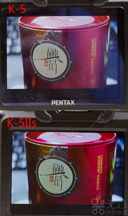 下面是考验防反光效果,将两台相机分别放到同一个位置,调整观看角度使LCD屏幕上出现灯光的反光,可以看到K-5IIs的反光要明显弱一些。