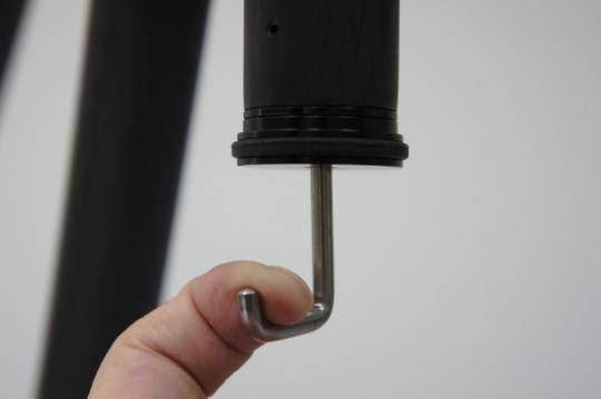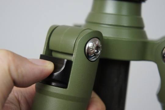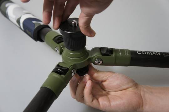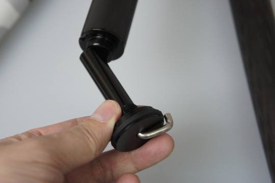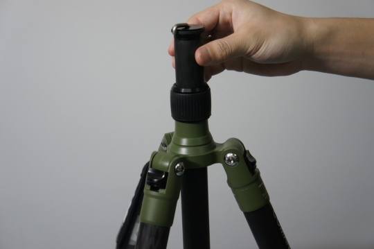 首先是去出中轴底部的挂钩(熟悉三脚架的朋友都知道,这个中轴挂钩可以在需要的时候悬挂一定重量的物品,例如摄影包,用以增加整个三脚架的稳定性,特别在户外一些风较大,或者地面不太平坦的地方有奇效)。挂钩只需通过简单旋转便能取出。
