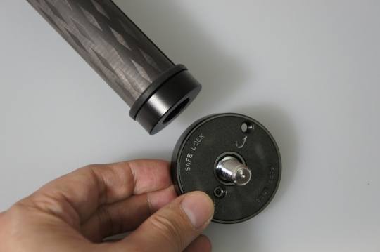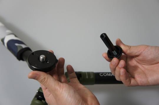 第二步是扭开中轴和云台结合出的法兰板,然后松开中轴紧锁的旋钮,就能够抽出整根中轴。
