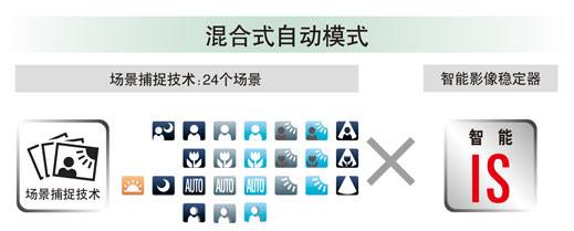 使用混合式自动模式拍摄,可自动创建日记短片(摘要短片)。在拍摄照片的同时,相机会自动记录每次拍摄前约4秒的内容记录为摘要短片,并可自动编辑,将这些记录的短片保存成一个短片文件,还可根据需要删除该模式下记录的单个片段。与照片的幻灯片播放功能不同,用短片回顾以往的精彩时刻更有身临其境的感觉。值得一提的是,混合式自动模式在原短片摘要功能基础上进行了升级,结合了“智慧AUTO”和智能IS光学防抖技术,在拍摄过程中,相机可自动识别24种场景,同时影像的稳定性也得到了提高,减少画面模糊,帮助用户得到更好的画质。