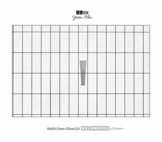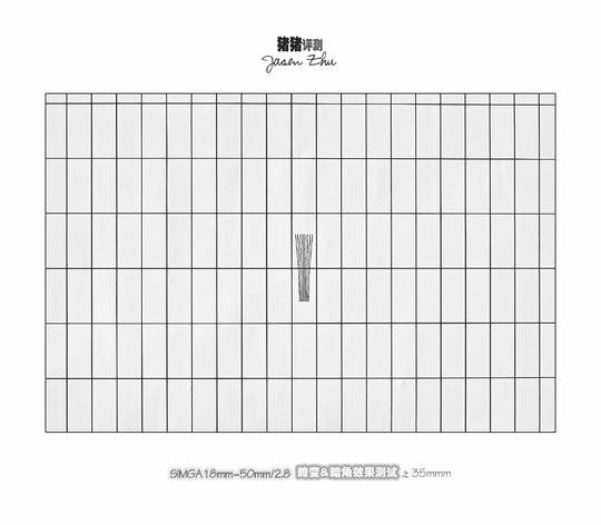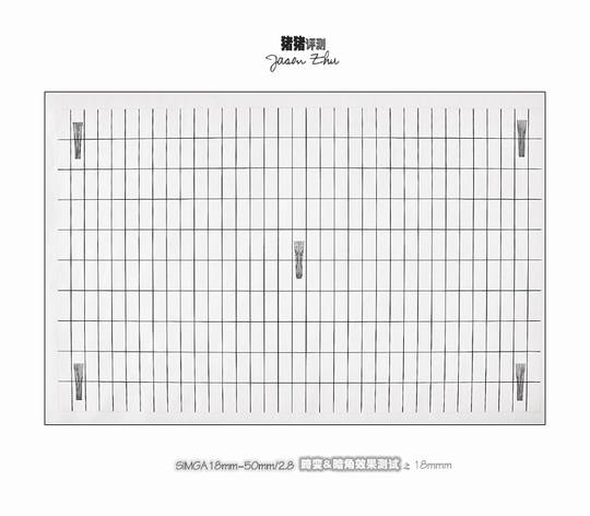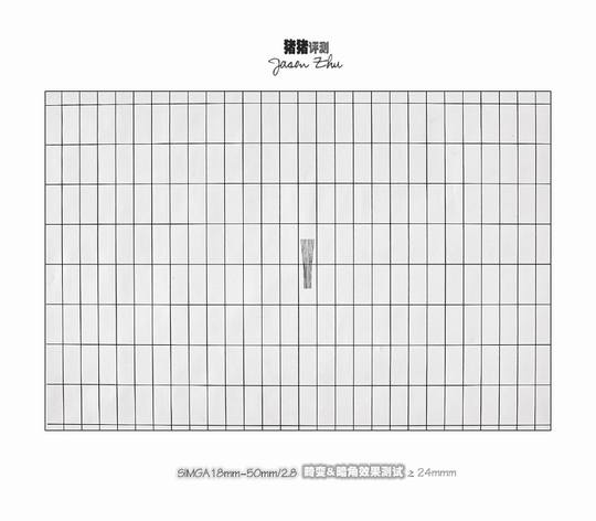除了在18mm端的桶状变形略明显之外,从24mm开始桶状变形就变得很小了,到了50mm已乎看不到畸变了。(由于测试纸的装裱尚未完成,不能作到100%纯平,故而实际效果一定比测试还要好)