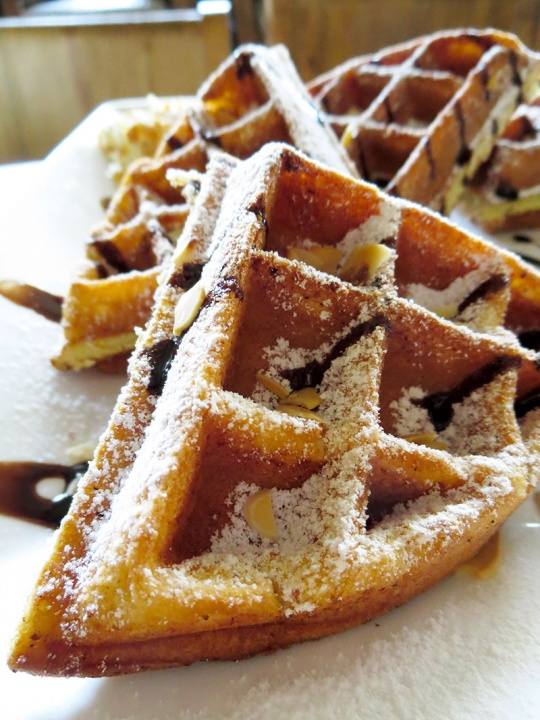 当然,我们无法要求每个餐馆中都有自己独特的器皿和好看的外形。如果遇到了这种情况,笔者推荐大家在拍照时合理调整自己的构图来取长补短。寿司和华夫饼则是大家日常能随便吃到的食物,甚至在一个商圈内都能找到好几家不同的餐馆,在这些熟悉的食物中就可以利用这点。一个个排好的寿司正好想成了一条直线,多个华夫饼层叠摆放,通过近大远小的原理将第一个寿司着重表现,而后形成空间内的延伸感,最后看上去是不是比大家自己吃到的更诱人呢?