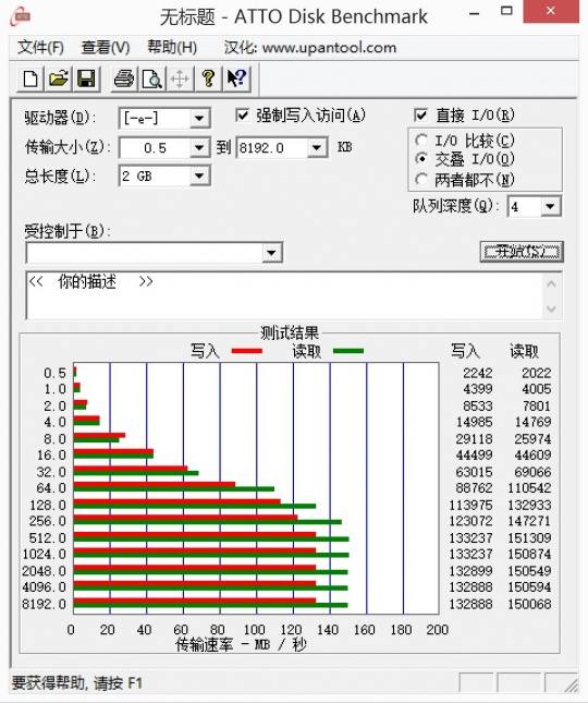 使用另一个软件ATTO Disk Benchmark测试得到的结果是写入速度约为133MB/s,读取速度为150MB/s,测试结果的截图如下: