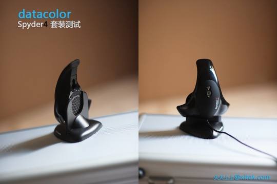 其中,Spyder4套件中有直立支架一个,测试显示器时可以很方便竖放在桌面使用,不需要像3代中挂在显示器上。