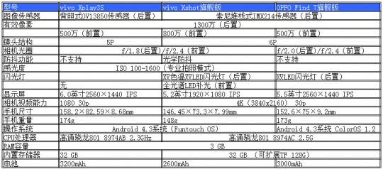 vivo Xshot旗舰版采用高通骁龙801系列8974AC处理器,3G内存以及32G存储空间,支持TF卡扩展(128G)。屏幕5.2英寸1920 X 1080分辨率。后置摄像头搭载1300万像素第二代堆栈式IMX214传感器,F1.8大光圈OIS光学防抖镜头及双色温闪光灯;前置摄像头为800万像素,具备84度广角,此外还配备了全光谱LED补光灯。摄像方面则支持4K视频录制。那么Xshot与Xplay又有什么区别?首先是定位Xplay强调影音功能,而Xshot则强调拍摄功能。下面我们看一下Xshot与Xplay3S、OPPO Find7规格对比