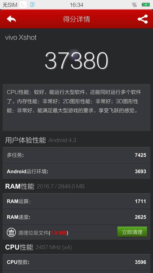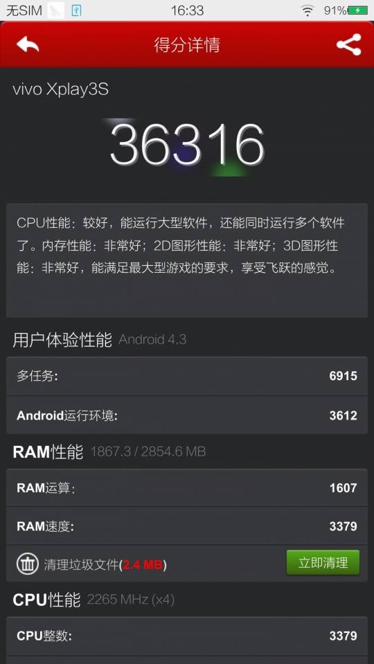 在拍照性能测试前我们先看一下Xshot的硬件性能,vivo Xshot旗舰版的配置为高通骁龙801系列8974AC 2.5GHZ处理器,3G内存以及32G存储空间,支持TF卡扩展(128G)。屏幕5.2英寸,1920 X 1080分辨率。同门Xplay3S则是高通骁龙801 8974AB 2.3GHz处理器,3G内存以及32G存储空间,6.0英寸2560×1440 IPS。两者主要差异是处理器频率和屏幕分辨率。下面我们使用安兔兔测评V4.4.3进行测试: