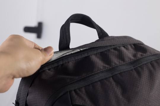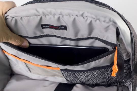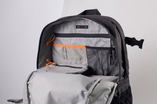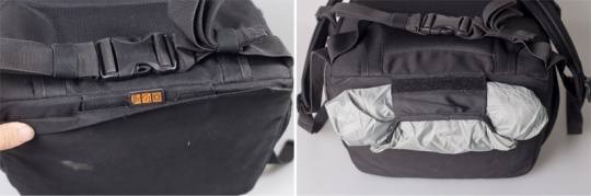 350AW有三个大的收纳格,为有效阻挡水滴的侵袭,上图中多媒体器材仓使用的是防水拉链,密封比较好;而另一侧有帽檐覆盖的拉链则是笔记本电脑的收纳仓,帽檐作用于防止细小沙石进入拉链,但会影响拉链的闭合流畅度。