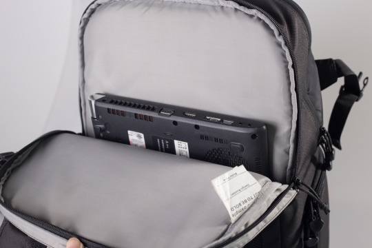 话说回来,350AW的电脑收纳仓可以装下17寸的手提电脑,这着实令笔者感到欣喜。笔者将手上15尺的笔记本电脑放入其中,空间到底有多宽敞,上图足以说明一切。