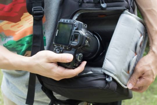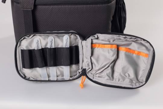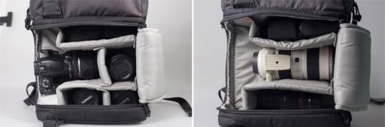 实际测试告诉我们,得益于空间设计的合理,乐摄宝DSLR Video Pack 350AW的主器材空间容量令笔者感到惊讶,能完全放下一机四镜或一机两镜(70-200、24-70),一支闪光灯。