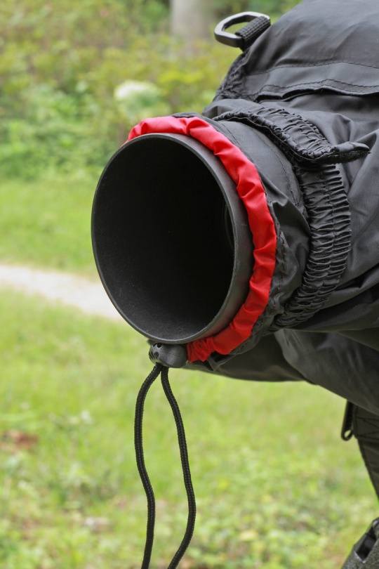防雨罩上面有两个相机带连接扣。镜头部分有双重松紧带,我使用的镜头是老款“百微”,装在上面长度刚刚好。
