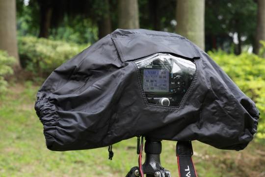 防雨罩有两个带松紧带的袖口,可以双手分别插进去。分别试一下开机、手动对焦还有背面的各个按键,双手基本上可以操作自如。唯一不方便是就相机双肩上的转盘和显示屏就看不完整了,只能在熟悉相机的前提下盲操作了。
