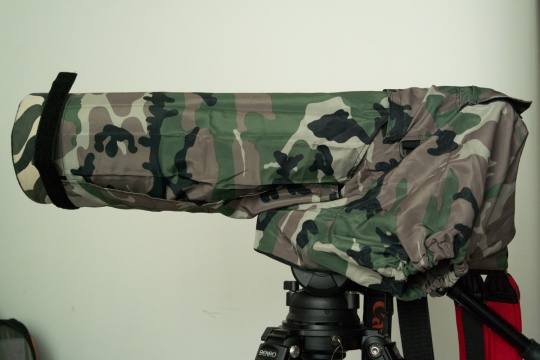 看说明是说这款防水衣广角长焦都可以用。长焦适合最长450mm(镜头长短)的镜头使用,我分别在Canon EF 400mmf/4.0 DO(440)和EF 500mmf/4.5 L(545)上试了一下,感觉都不错545不装遮光罩ok,装了就稍微短了那么一点点,用也没问题。
