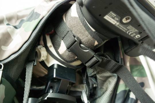 我的相机是5d3,加了手柄后体积和1ds系列差不多了,放进去后防雨罩内部还有合适的空间。那条双开拉链在相机的底部,手持相机的话拉链可以要全部拉拢,如果要把相机固定在三脚架上,双开拉链只需留适当的口子就可以了。因为口子在底部,雨水是进不去的。