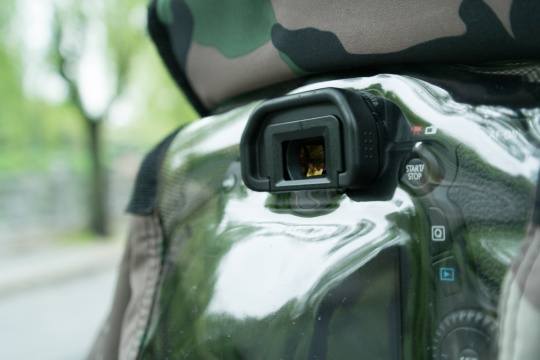 接下来就是实战,观察鸟儿育雏的那几天正好都是下雨,于是我带上防雨罩就出发了。防雨罩可以通过各种搭扣紧密的固定在镜头上,不用担心风大会把雨衣吹起来。相机这里需要取下眼罩套上透明观察窗再装上去,另外装大口径长焦镜头的时候记得先别装遮光罩,等防水罩短镜头套固定好了再装,最后扣紧长镜头套。