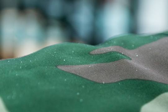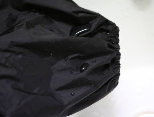 因为最近几天广州的天气出奇的好,一直没有机会在雨中实战试用,产品面料的防水性能只能在洗手间里试了。经过人为的泼水试验,发现面料具有类似荷叶的憎水性功能,水落在上面会迅速形成水珠滚落。查了一下,原来这个面料叫塔夫绸,是很好的防水面料,这让我对它的防水性能比较放心。