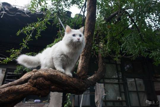 在各种大大小小的犬类占据了胡同的地面空间。块头小一些但却天生会“飞檐走壁”的猫们,就把自己的领地向高处发展了。走在胡同里,抬头在房檐、在枝头看到一只美丽的大猫自顾自地卖呆或卖萌都是在正常的事。图片拍摄于2007年的夏天,就在我准备转身从这个院子离开时,一直雪白毛色、蓝色大眼睛的美人儿就忽地跳到了我眼前。我抓起相机记录下这个难得的瞬间。