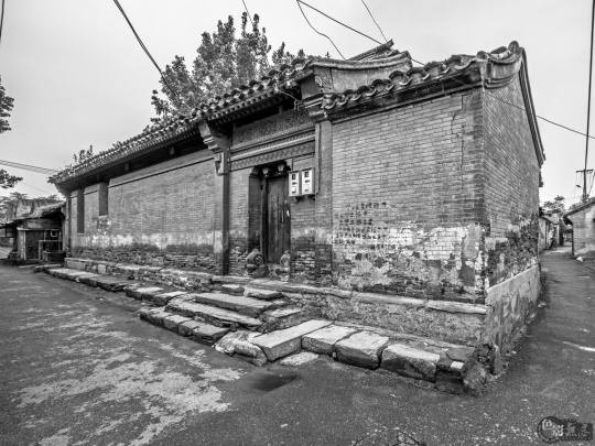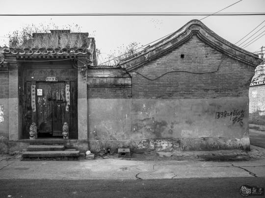 下面这张照片,是帖子里唯一一张用这一组合拍摄的胡同题材照片。主角是“拐弯抹角”——“拐弯抹角”是胡同里一种常见的建筑形式,在旧时胡同间距狭窄,在有大型车辆行驶时,如果车辆内侧建筑转角是直角,则非常不方便实现转弯。因此人们在建筑四合院时会有意将处于街角的房间的角线抹去,改为砌为圆形转角。以方便大型车辆在胡同里通行。