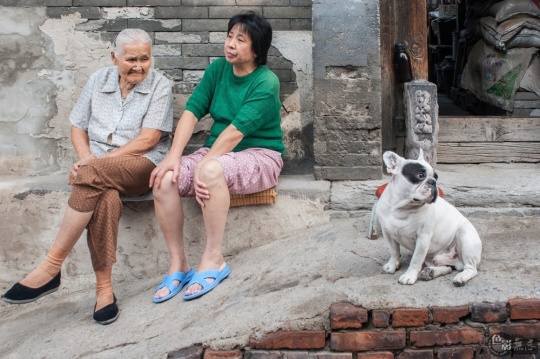 图片拍摄于2007年夏末秋初,拆除前的米市胡同。磨砖对缝的大院门前,家里的两位女主人带着他们硕大的斗牛犬闲坐清谈。有话题就说一说,没话题就这么呆着,也不会觉得尴尬。老奶奶似乎很好奇,家里的牛牛发现了远处的什么,看得如此聚精会神呢?