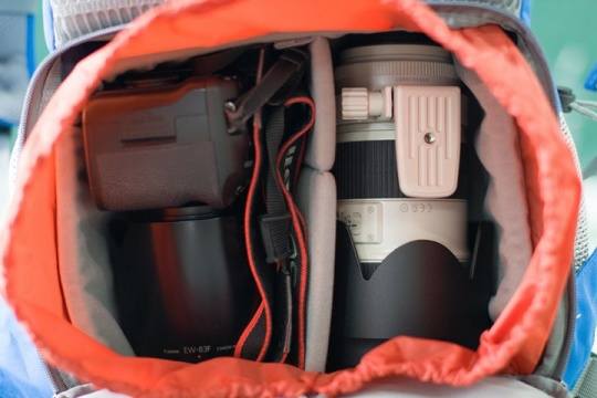 笔者那天装载了一台5D2加24-70镜头和一个“小白兔”,虽然此款背包整体的设计理念是灵巧轻便背负,但是装弹量也十分强悍。官方数据显示此款背包可以装载1机2镜1闪。可见其灵巧时尚的外表之内还具有一个宽敞的“内心”。