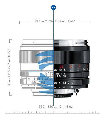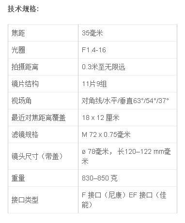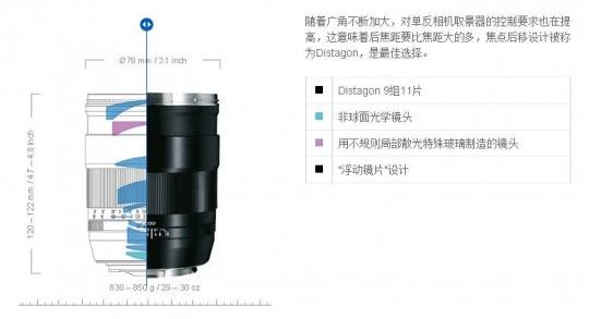 35 F1.4的Distagon结构由9组11片的非球面镜片包括一片不规则局部散光特殊玻璃组成,同时采用浮动镜片设计,这一切设计都是为了校正近距离对焦时像场的偏差,消解影像边缘解像力劣化的问题。不过这么多组的镜片以及全金属的镜身也使得该镜头体型巨大,重量达到830克。
