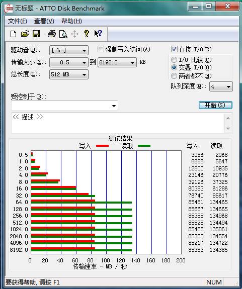 首先使用ATTO Disk Benchmark进行跑分。这款软件可以对读取和写入分别作出一个平均数值。从实际的测试结果来看,笔者对这款高速CF成绩还算满意,它的读取速度实际大约在134MB/s左右,而写入速度大约为85MB/s左右,这样的结果与官方给出的理论速度相差并不大。考虑到电脑平台和读卡器的客观影响,它的数据绝对是可以接受的。在处理大数据量的照片时,也可以流畅的完成。