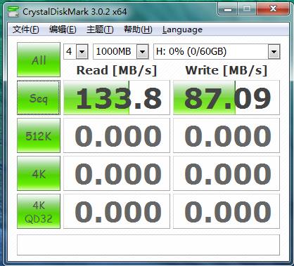这是另一款著名的测速软件,也可以分别对读取和写入进行测试。从图上的成绩可以看出,在CrystalDiskMark3.0.2下 这张64G卡的表现要比在ATTO Disk Benchmark上好一些。读取的速度差不多,在133MB/s左右,但写入要快一点,达到了87MB/s。可以说这款卡传输的稳定程度非常不错,没有出现大起大落的现象,这也是一张专业存储卡应该有的素质。