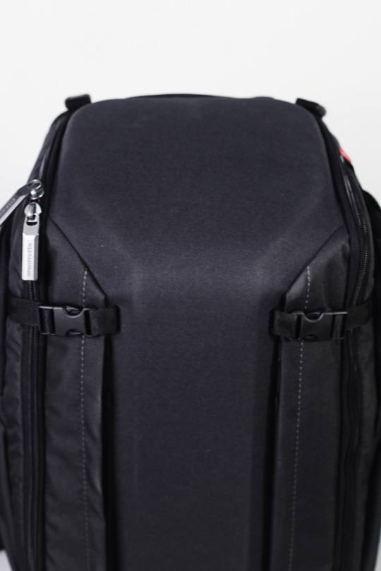 正面是一块覆盖整包的T型热塑贝壳防护结构,能有效的防撞,从而保护这块“贝壳”下的摄影器材。该结构共有三层,表面为高性能织物面料,内里采用多层吸震软垫与绒织物柔软里料结合。由于采用热塑工艺,使整个正面能很好的保持版型,即使在外力的冲击下,也能起到支撑的作用。