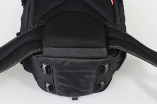 正面有四个小的尼龙环,可用于系上随包附送的脚架紧固带,锁定脚架。不使用时可以隐藏在正面的两旁。