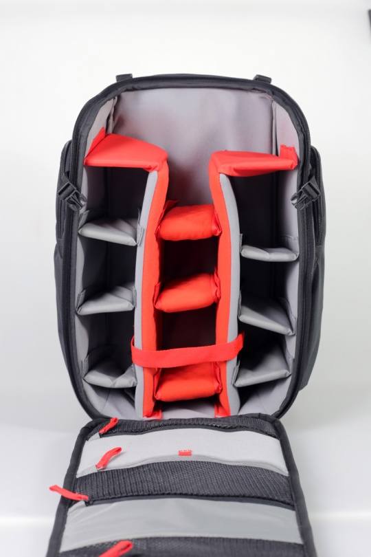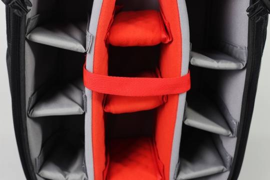 内部空间十分之大,随包附送了11块可拆卸隔层和一条魔术贴紧固带,用于固定长焦镜头。