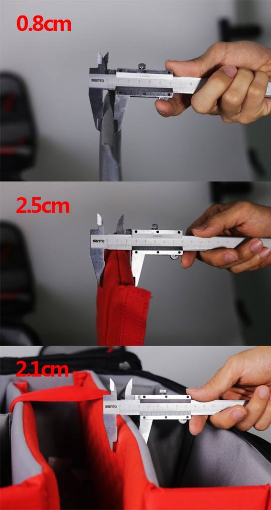 该隔层名为加厚波浪形吸震海绵,厚度十分之厚,采用三层材料合并而成。表层为拉绒织物柔软面料,内里为3D波浪形吸震软垫以及结构加固隔板。