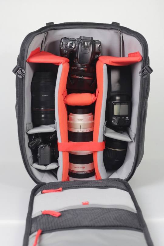 接下来,我们来看下BP50的内部空间。该包是MP-BP系列容量最大的一款,可以装下二机七镜,还有闪关灯等其他附件。即是两台机子都是全画幅带手柄的单反也可轻松装入,同时包的长度也允许装下70-200mm这类的长焦镜头。