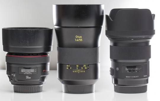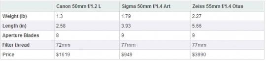 首先外观对比来看 蔡司55mm F1.4 Otus的体积明显最大,其次是适马50mm f/1.4Art,下面看一下三款镜头的规格对比: