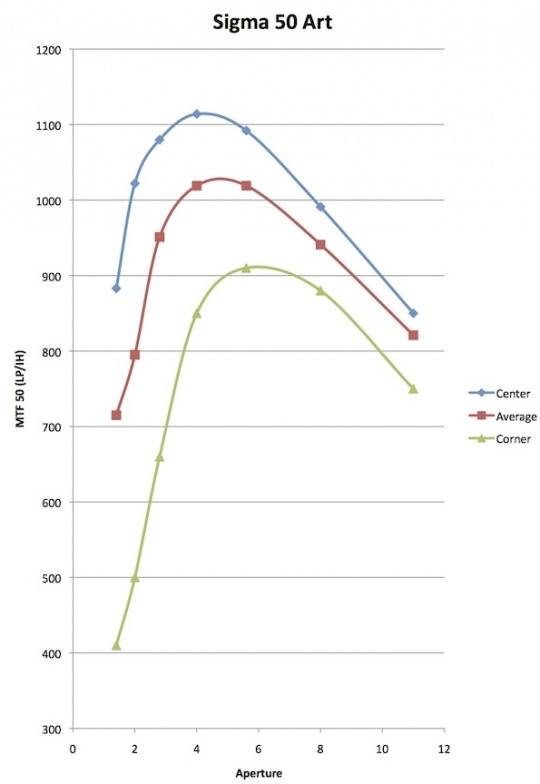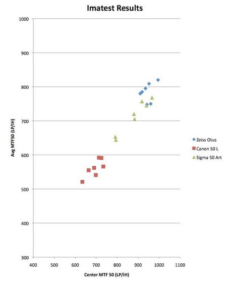 今年适马推出的50mm f/1.4Art镜头非常引人注目,国外、、均对这款镜头(佳能口)进行了客观数据测试。lensrentals(出租器材)也对这款镜头(佳能口)进行了Imatest分辨率测试。对比对象分别选择了蔡司55mm F1.4 Otus、佳能50mm F1.2 L。
