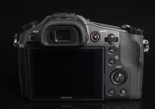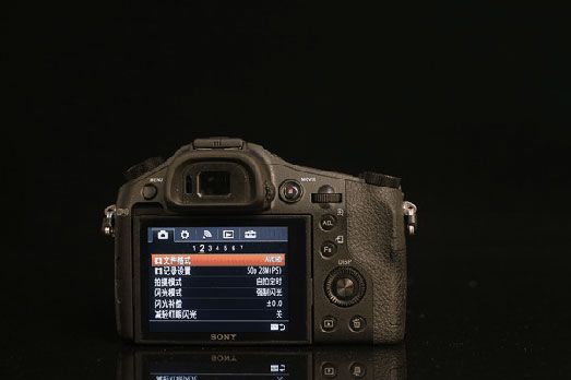 RX10的后背设计也基本是单反的风格,RX10使用了一块3英寸的屏幕,其像素达到了惊人的123万,可以提供非常精细的画面回放效果。同时这块背屏还可以进行上下角度的翻折,更方便低角度的取景。背屏的右侧是相机主要的操作按键。相机设计了一个后拨轮,用于进行相机快门速度或者其它参数的调节。而相机中部还有一个大的圆形转轮,可以方便的选择不同 的菜单项目,又是四方向快捷导航,可以进行快速设置。除此之外就是录像开关按钮,曝光锁定,Fn自定义菜单以及回放钮等等。