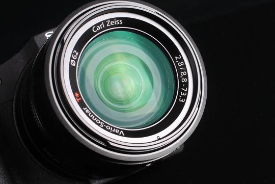 RX10最大的亮点除了传感器之外就是采用了蔡司的24-200mm F2.8大光圈镜头。这支镜头也理所当然的打上了红色T*镀膜的标识。它的口径达到了62mm,这在小型数码卡片相机里也不是不多见的,属于大块头的重量级产品了。T*镀膜呈现出了淡绿色,非常的漂亮。蔡司的身份加上大光圈镜头,这让人第一眼看上去就知道RX10的高端定位了。