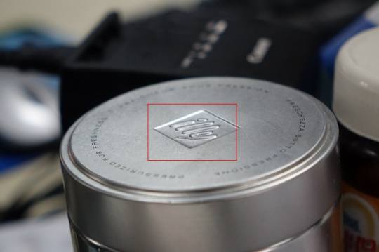 首先是紫边的测试,笔者设置了一个相对严酷的环境,拍摄一个金属反光的咖啡桶。大家都知道金属的反射光是非常强的。这样的测试才能体现出镜头的真实实力,笔者还是截图中红框部分进行放大。
