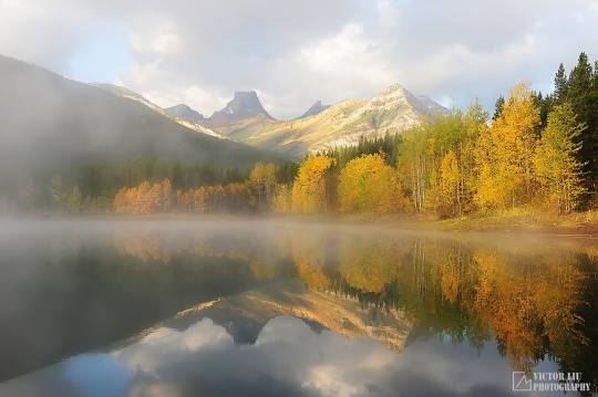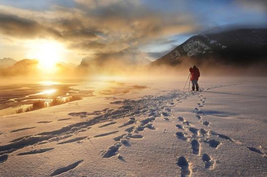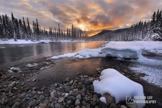 这张片子是在一个11月阴天的早晨拍摄的,当冬天刚刚降临到落基山和班夫国家公园,这个时候往往气候早晚温差大,白天暖和,夜晚寒冷。准备起来就要带足御寒装备,比如厚的外衣和手套。这个地点的选择也是比较有讲究,在一片杂草和树木的后面,需要一些雪中跋涉,但并不太远。从拍摄的前一天开始,我就关注天气预报,直到早上出发最后一分钟,这样做的好处是能确保尽可能的了解天象,而多云对于一个有经验的落基山风光摄影师来讲,就是很有可能出片。