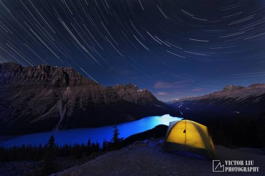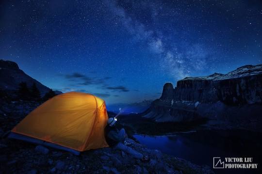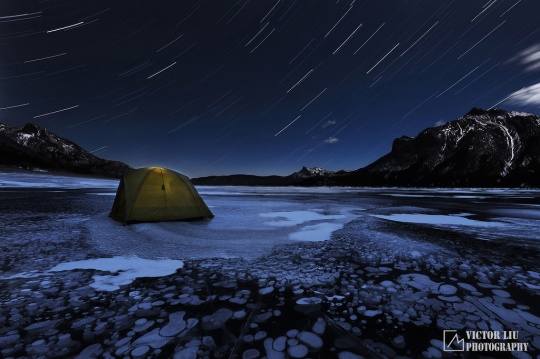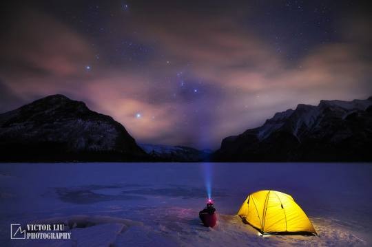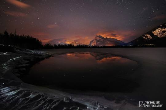 《暗夜魔法世界》是我在今年初拍的一幅作品,整个过程可以说跌宕起伏,充满了戏剧和偶然性。这里我先做一个地点的背景介绍,班夫的朱砂湖是加拿大落基山很有名的拍摄日出日落的点,尤其是在冬天,冰雪和流水交融,在朝霞下光彩夺目。然而很少有摄影师拍摄这里的夜景,多半是由于它临近班夫城,光污染很重,不利于星轨和银河的拍摄。不过作为一名本地山区摄影师,我是经常寻找鲜有人问津的地点和时间段的,所以朱砂湖的夜拍顺理成章。