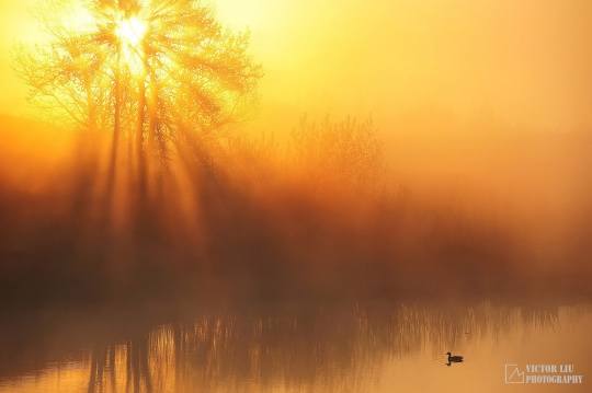 这张片子如果没有左上角洒下来的光束,就会逊色很多,当然,从构图的角度来讲,这些光和右下角的鸭子形成呼应,但是这里主要讨论用光,强调的是光的形态,其实光本身是无形的,但经过雾气和树木的烘托,就形成了一道一道的斜线,片子中只要将这些斜线拍出来,再加以在构图上精雕细琢,就可以有很不错的效果。再看下面一片: