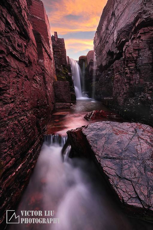 跨 过这小溪上的最后一块石头,我已经可以看到远处的红岩瀑布了,那里比其他的岩石都高,形成了一个不大不小的峡谷,真是大自然的鬼斧神工,这样整齐切割的绝 壁似乎只出现在人类的建筑中。我加快了步子,手脚并用的攀到了一座小山坡上,这小山坡连接那红岩瀑布的顶端,草丛中软泥上的脚印显示这里曾经有人来过。我 想,不止一个人曾躲避巡林员来到这里吧,对于风光摄影师来讲,这是落基山的一处圣地,我深深的吸了一口气,朝着那水流的方向走去。此时,日落的红光如潮水 般袭来,将这瀑布,岩石,和肆无忌惮生长的野草包裹,“今夜又是一个看得见银河的夜晚”,我寻思着。