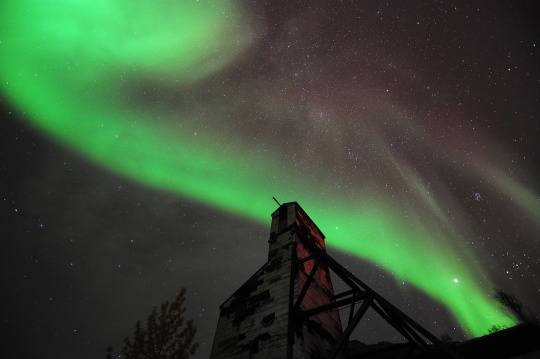 在黄刀郊外唯一的一条高速公路入口,有一个废弃的金矿。20年前这里曾发生过罢工和爆炸, 最后导致公司破产, 无力收拾残局, 于是无论矿车还是升降机都这样静悄悄的矗立在那里,从来未改变过位置。这地方是我入夜拍摄极光的所在,我一个人,背着大大的三脚架,带着头灯,寻宝一般在午夜的矿区游荡,偶尔听到乌鸦的啼鸣和风吹木结构的咯吱声,与其说是恐怖,更多的是刺激。而我现在对那美丽极光的记忆,也都是跟这金矿联系起来,不能不说是当时彻夜守候的结果。