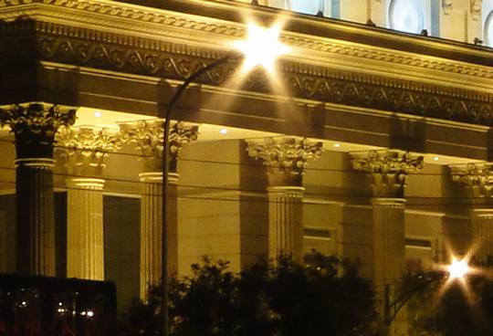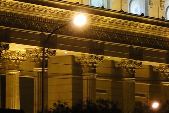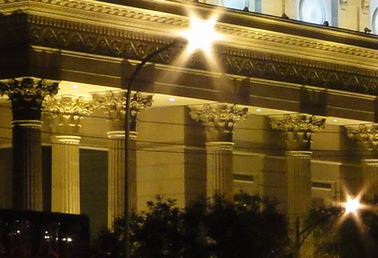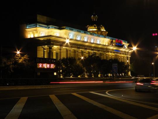 通过测试,我认为在三种模式下,将相机置于三脚架采用慢门,小光圈,低感光度拍摄的效果最好,图像较为细腻,在场景模式下选择夜景模式,其结果仍然是采用慢门、大光圈、低感光度进行拍摄,这样的拍摄是必须采用三脚架的,其结果应该与第一种差别不大,也就是景深和清晰度稍有区别。而手持夜景模式则不同于以上两种,它采用6张连拍,后期机内合成的方式,适当调整感光度的方式。在这种模式下,图像相对比较清晰(这一点出乎我的意料),噪点也比正常的模式要小不少,但是图片的边缘和反差相对较弱,很像是后期被磨过皮一样,图片显得很柔和,如果图片不放到很大,给人的视觉感受很舒服。
