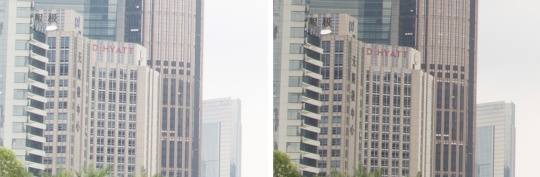 我们对第三组实拍照片以1:1的原尺寸局部截图,结果一目了然,在装上GND8软渐变后的成像质量与裸镜接近完全一致。由于画面的到有效压暗,图中建筑物边缘更加清晰,广告牌中的字体也更加清楚,可见耐司这块软渐变在成像质量上做到很好的保留,色散现象也有很好的控制,回过有再观察第三组照片的地面部分,颜色基本与原图保持一致,耐司GND8软渐变真正是做到低偏色了。