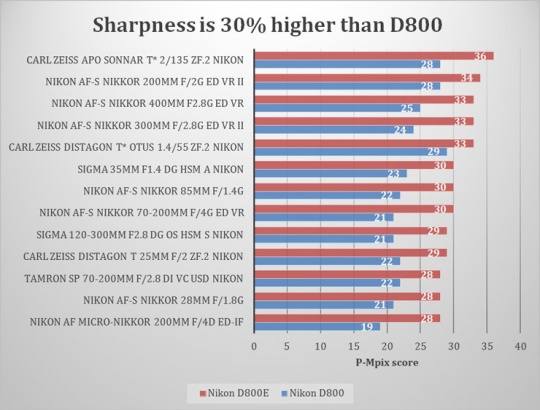 我们知道尼康的D800E是D800的高锐度版本,差别在于D800E采用了还原低通滤镜,已达到无低通效果,从而获取更高的解析力。国外测试网站DxOmark对此进行了测试,分别用D800E与D800搭载相同的镜头,进行锐度对比。测试中锐度最大差值达到30%,例如Zeiss Apo Sonnar T* 2/135 ZF.2,该镜头在D800上锐度28P-Mpix 而在D800E上可以达到36P-Mpix。在现实中,测试体现的是峰值最佳成像,实际拍摄还要考虑光圈等等设置。毫无疑问,这些镜头在D800E上比D800能呈现更多的细节。