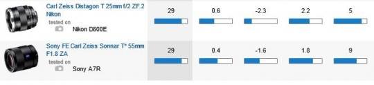我们可以看到D800E平台的镜头成绩占据DXO镜头测试前十中九席。排在第五的是索尼α7R搭配Sony Zeiss 55mm f1.8 ZA。α7R与D800E、D800一样,均搭载3600万像素传感器,而且没有低通滤镜。那么尼康D800E与索尼α7R两个原生平台对比呢?